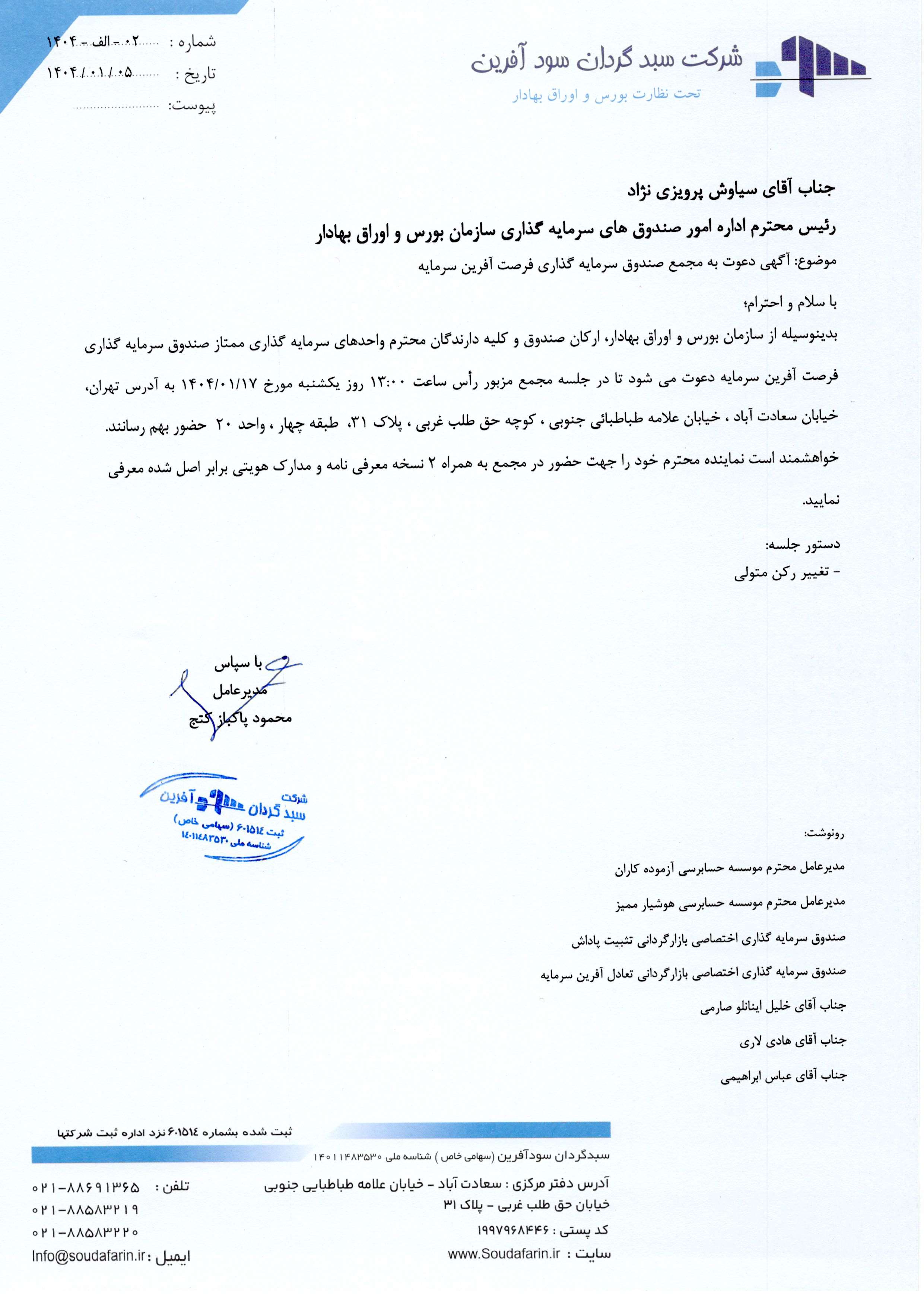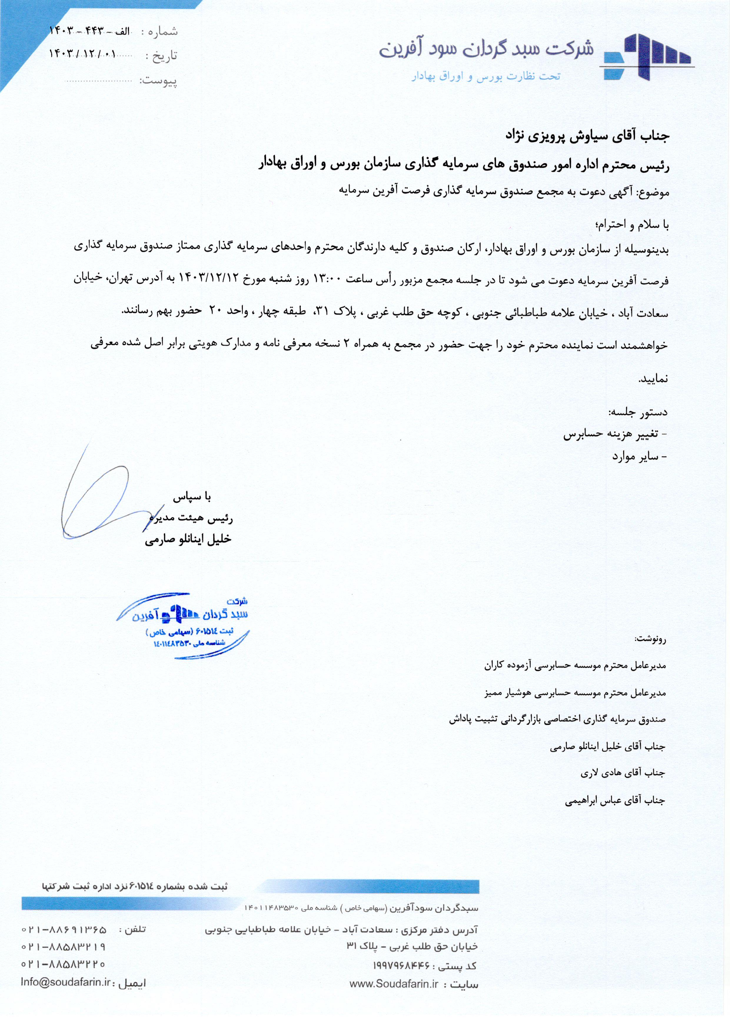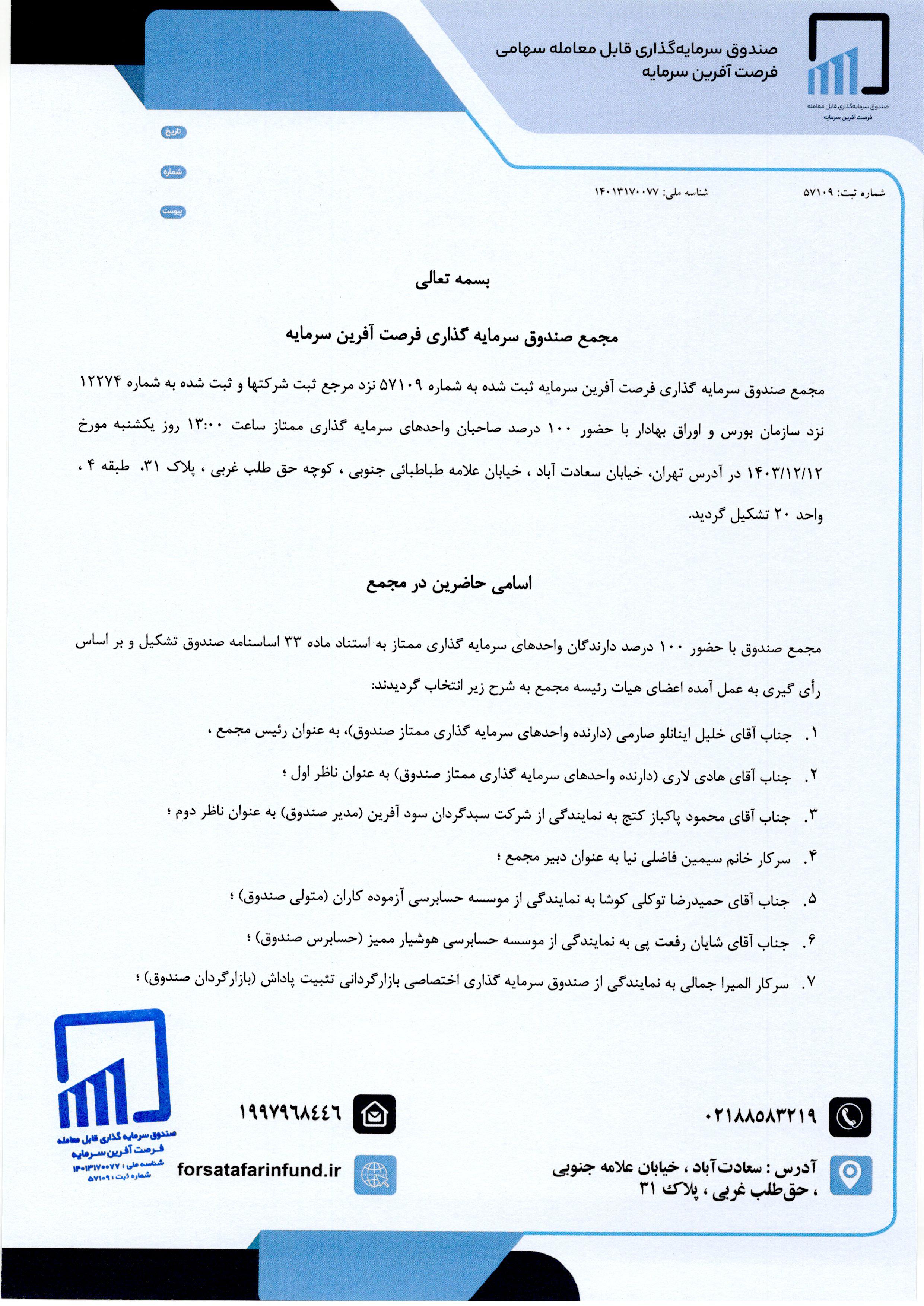 آگهی دعوت به مجمع صندوق فرصت آفرین سرمایه به تاریخ 1403/12/12