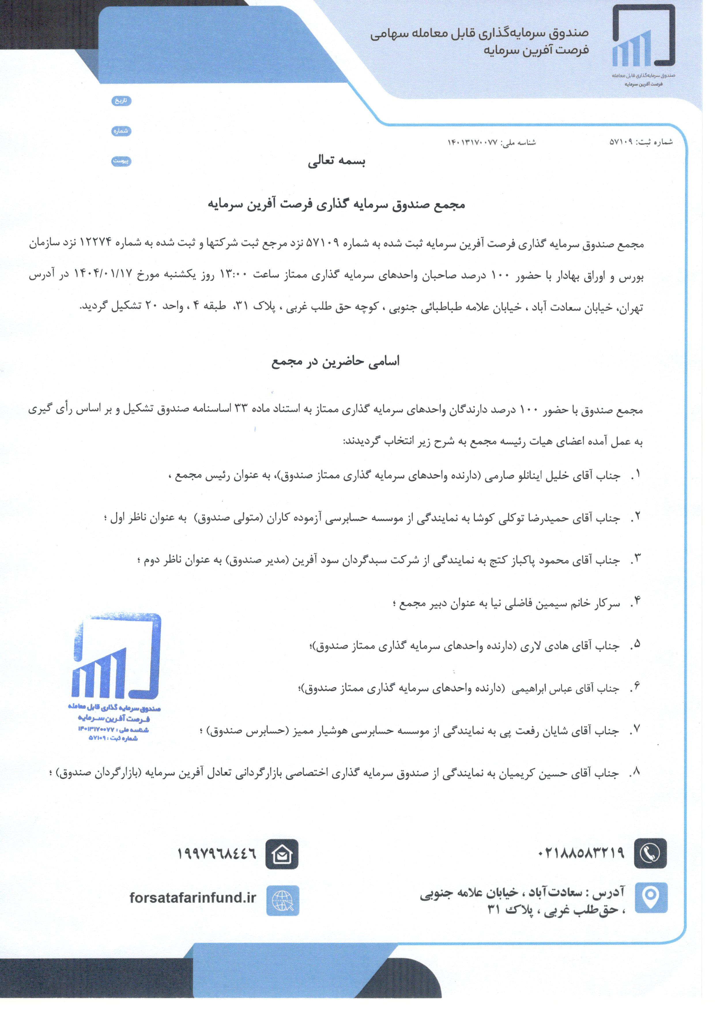 تصميمات مجمع صندوق سرمايه گذاري فرصت آفرين سرمايه در تاريخ 1403/12/12 (تغيير هزينه حسابرس )